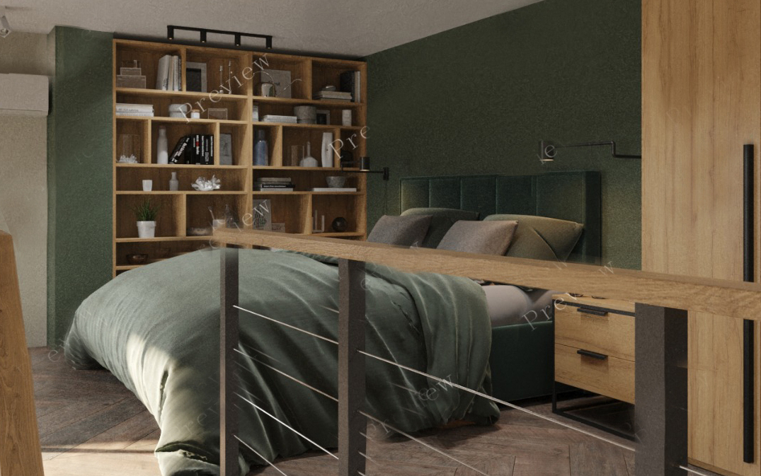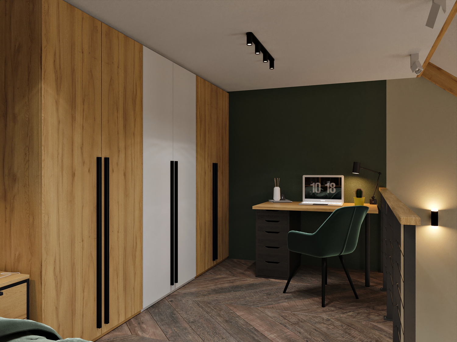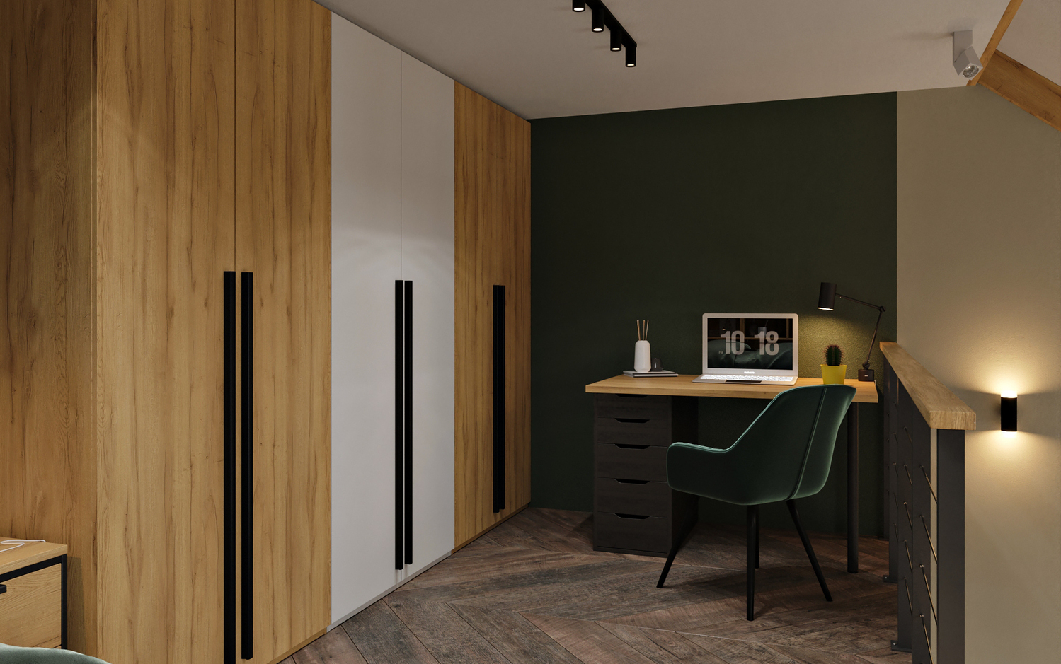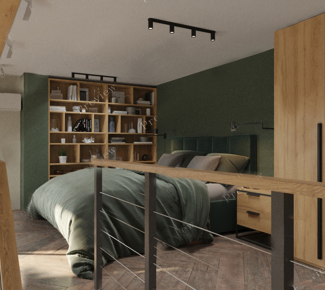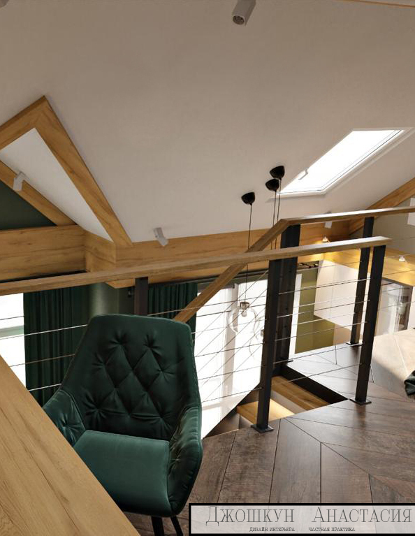 Антресольный этаж стал личным пространством хозяев, там расположилась спальня, гардеробная и зона кабинета. В интерьере хорошо сочетается игра светлых и темных оттенков.