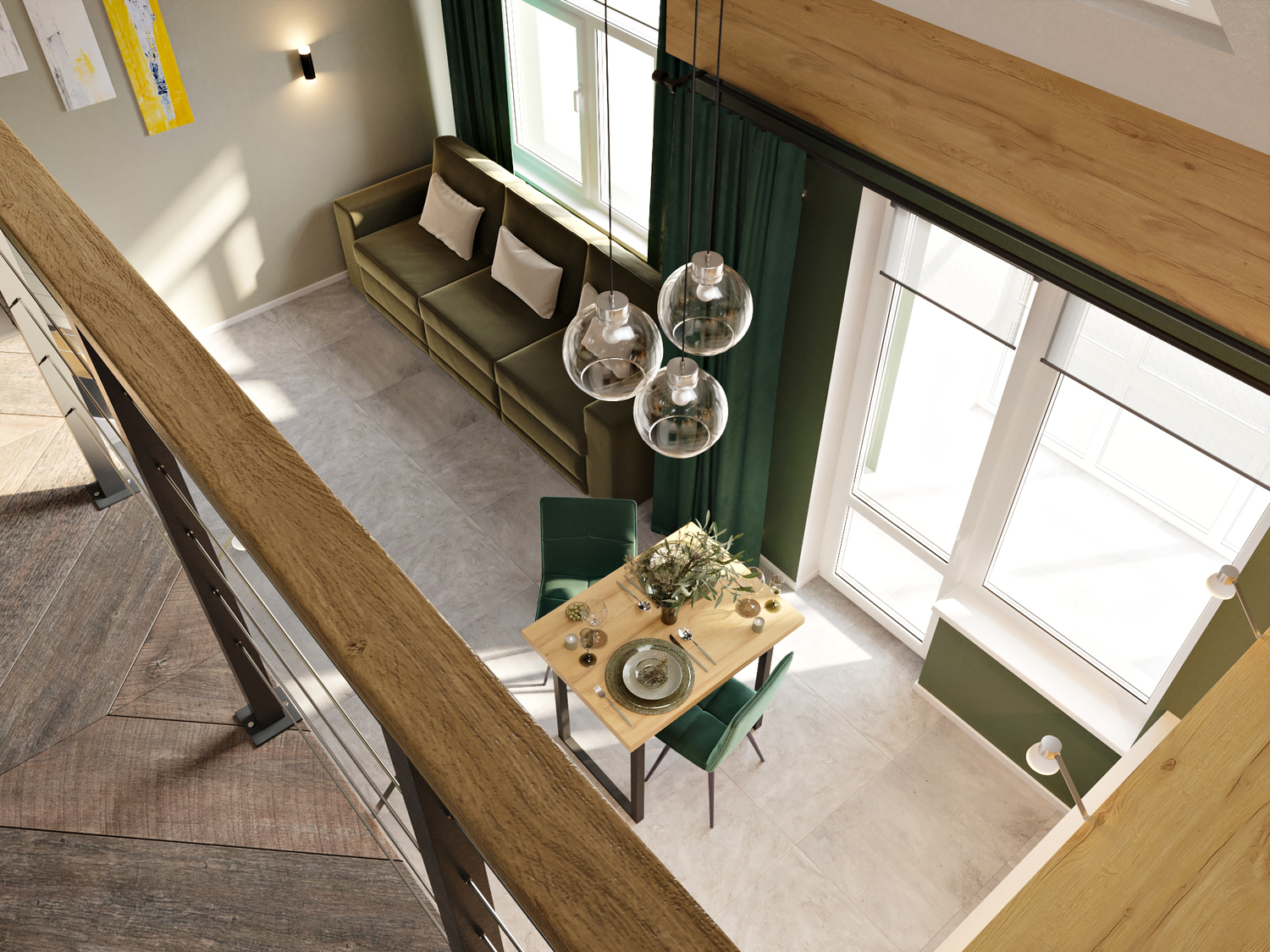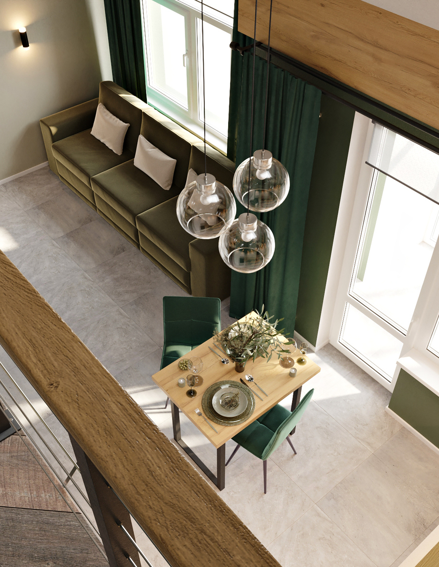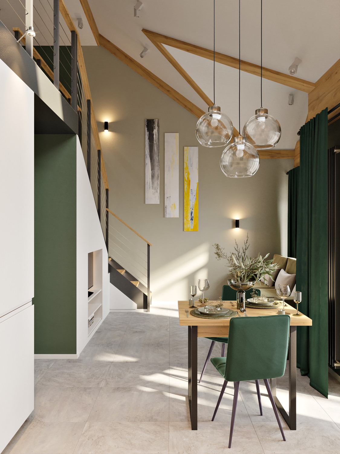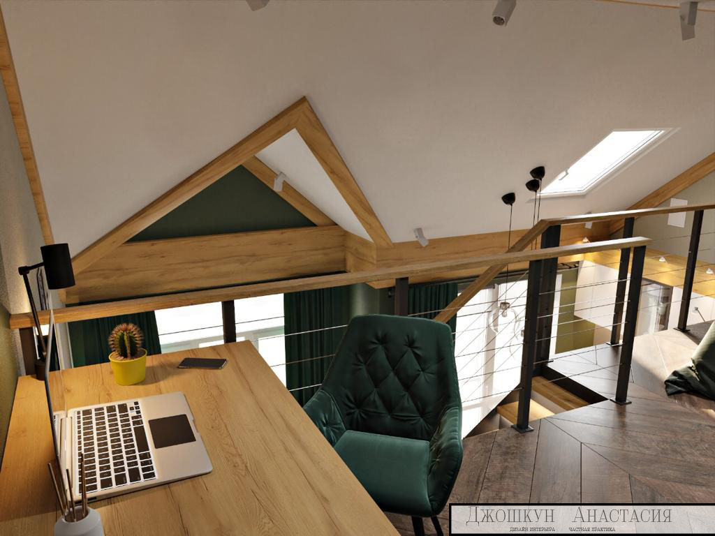Квартира имеет мансардный потолок и световое окно. Высота потолка позволяла сделать антресольную надстройку этажа, что и было реализованно. На первом этаже поместилась большая прихожая с вместительной гардеробной системой, санузел с душевой, и кухня гостиная получилась светлая и просторная. При скромных размерах объекта, здесь оказалось достаточно места для приема гостей и организации небольших праздничных ужинов.