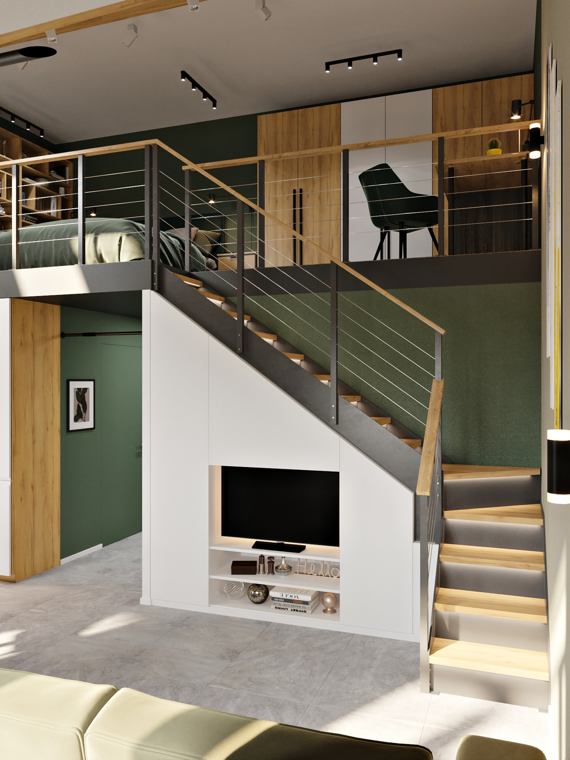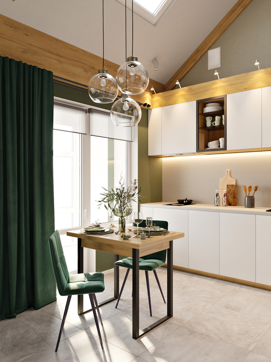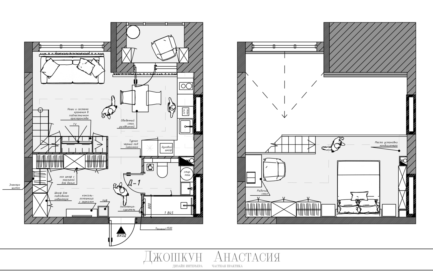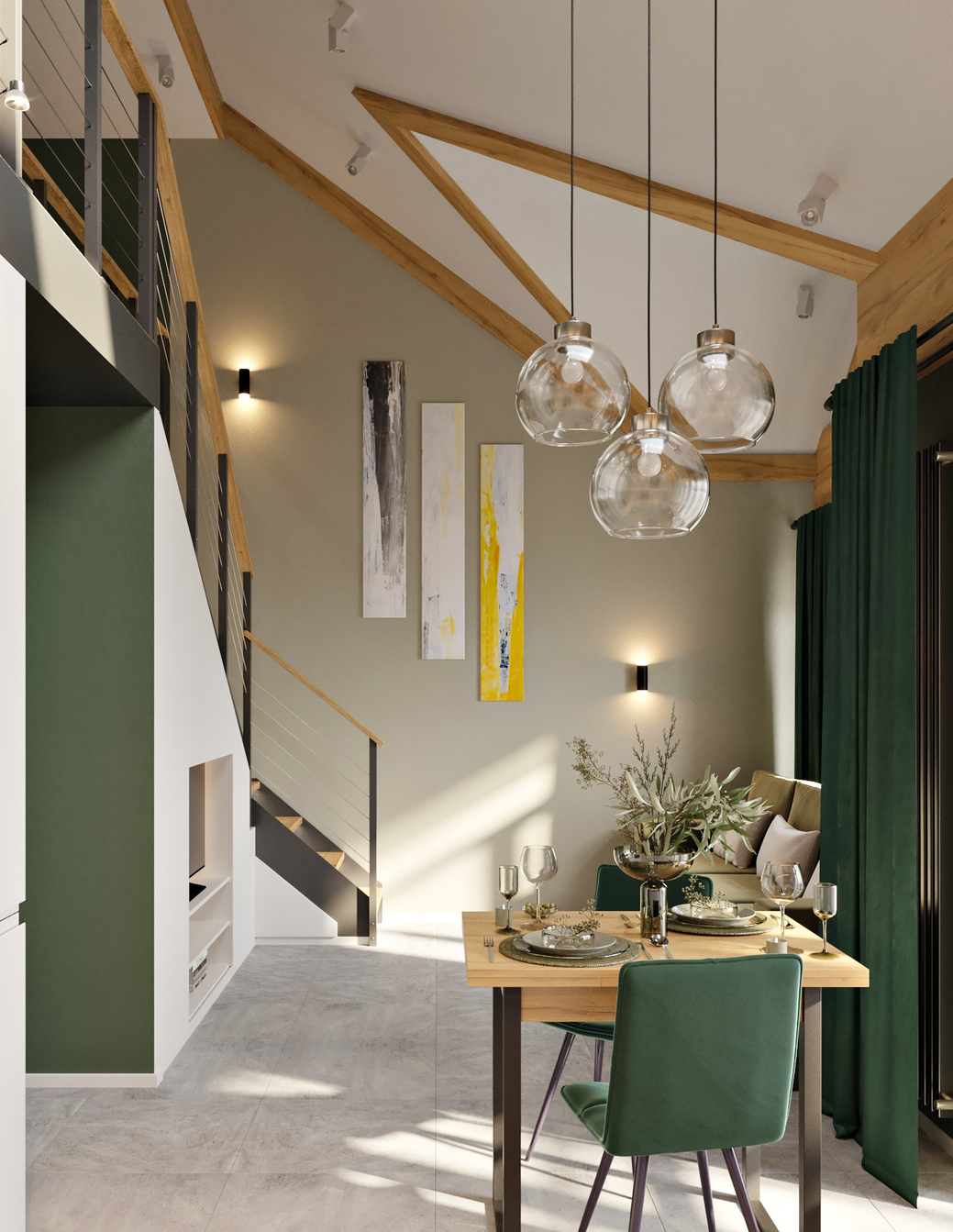 Квартира имеет мансардный потолок и световое окно. Высота потолка позволяла сделать антресольную надстройку этажа, что и было реализованно. На первом этаже поместилась большая прихожая с вместительной гардеробной системой, санузел с душевой, и кухня гостиная получилась светлая и просторная. При скромных размерах объекта, здесь оказалось достаточно места для приема гостей и организации небольших праздничных ужинов.