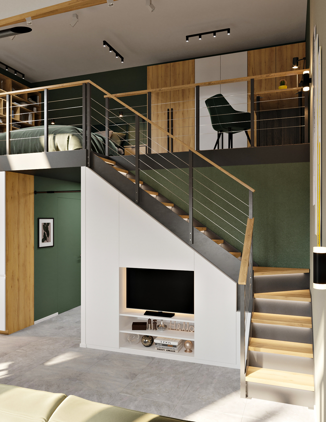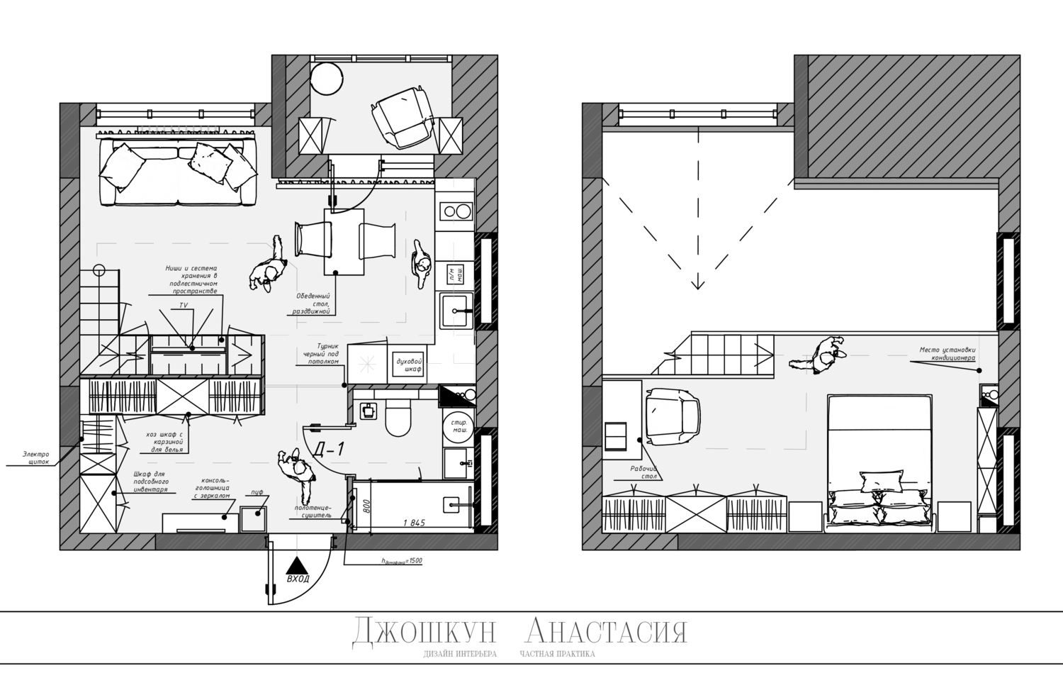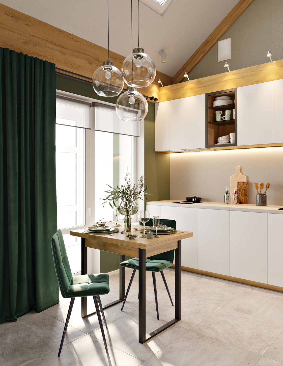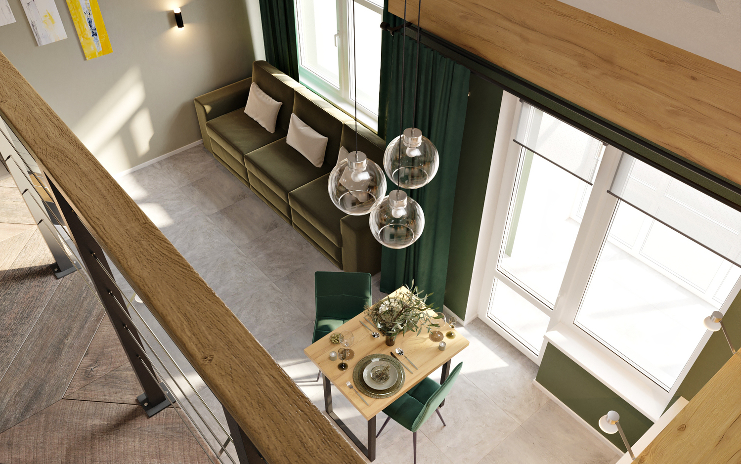 Квартира имеет мансардный потолок и световое окно. Высота потолка позволяла сделать антресольную надстройку этажа, что и было реализованно. На первом этаже поместилась большая прихожая с вместительной гардеробной системой, санузел с душевой, и кухня гостиная получилась светлая и просторная. При скромных размерах объекта, здесь оказалось достаточно места для приема гостей и организации небольших праздничных ужинов.