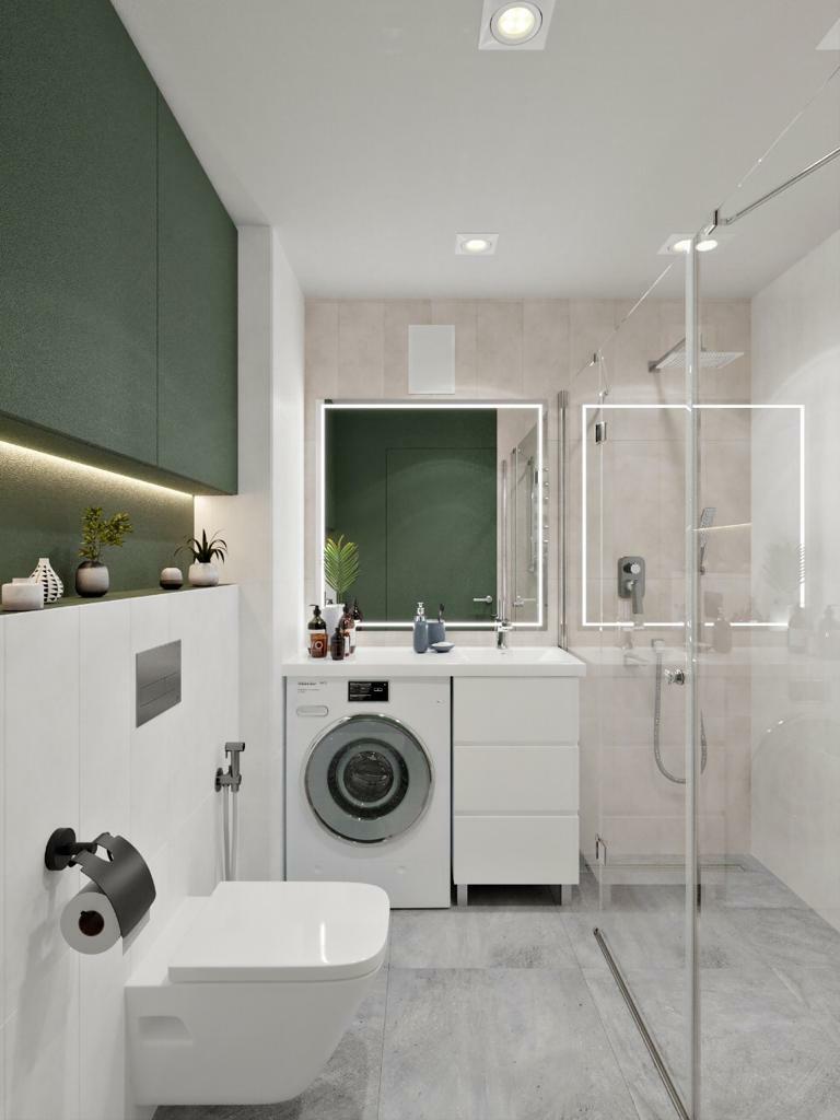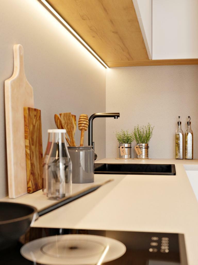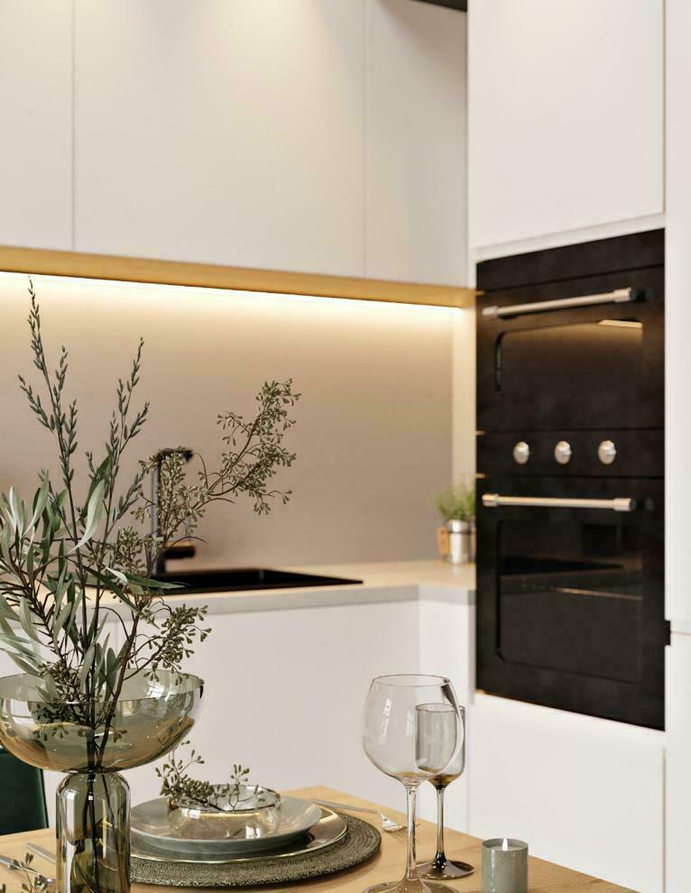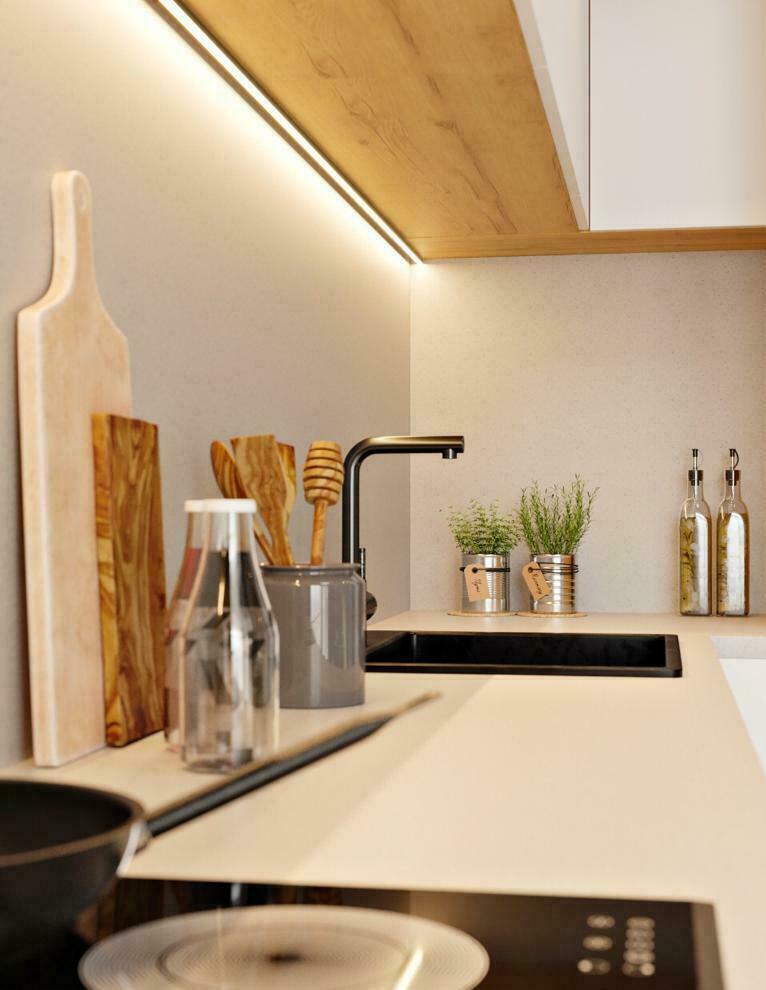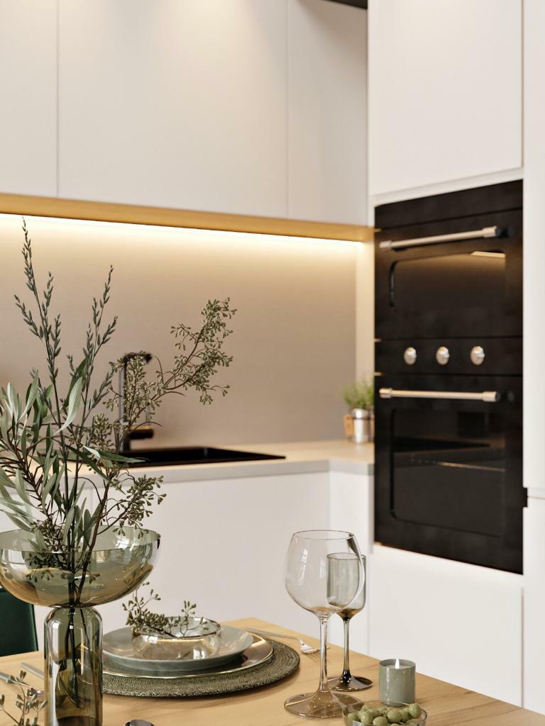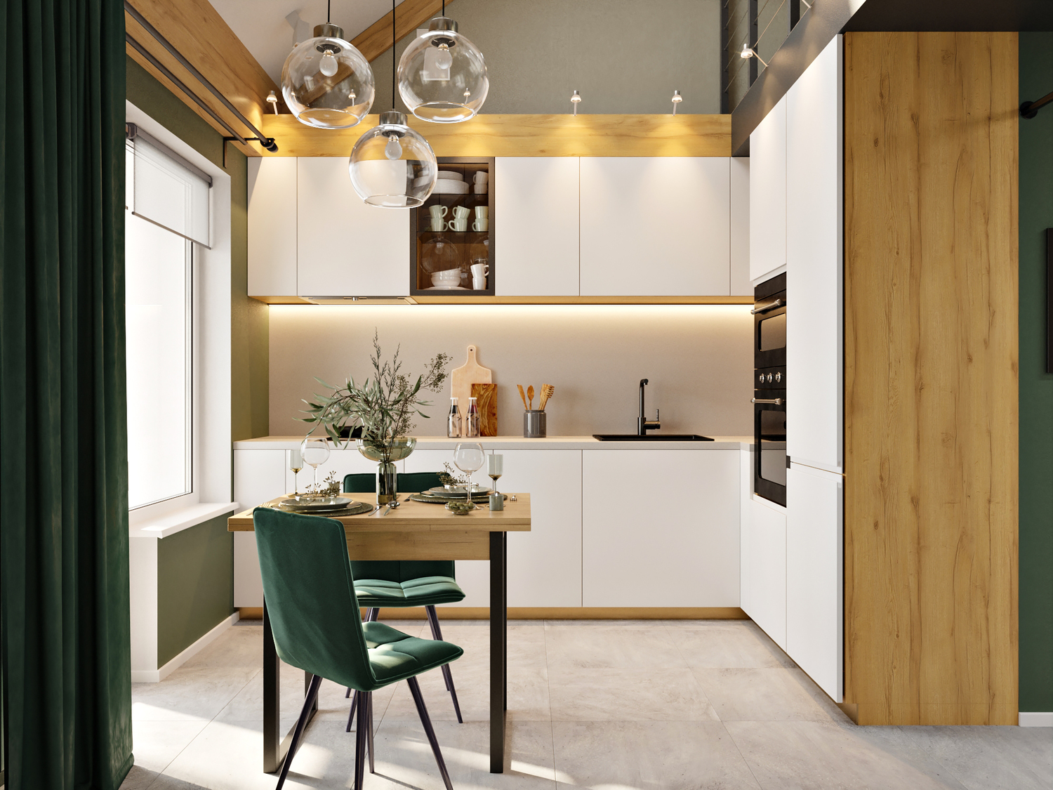 Квартира имеет мансардный потолок и световое окно. Высота потолка позволяла сделать антресольную надстройку этажа, что и было реализованно. На первом этаже поместилась большая прихожая с вместительной гардеробной системой, санузел с душевой, и кухня гостиная получилась светлая и просторная. При скромных размерах объекта, здесь оказалось достаточно места для приема гостей и организации небольших праздничных ужинов.
